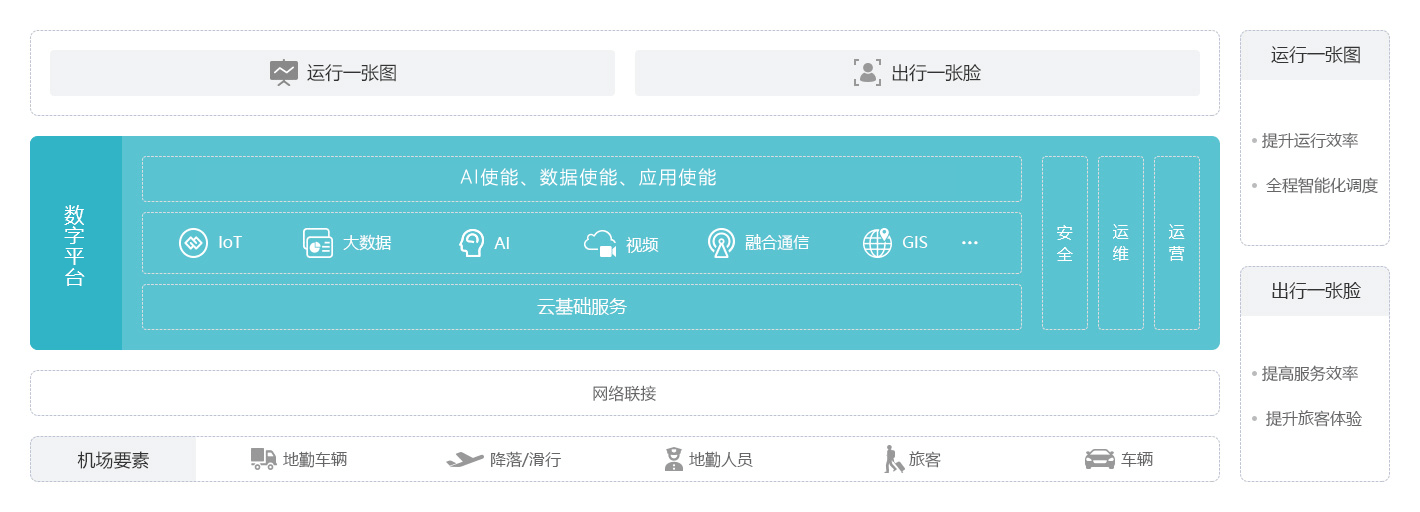 如何通过数字化手段提升旅客满意度及机场运营效率呢?智慧机场解决方案,融合AI、视频云、大数据、IoT、ICP等新技术,围绕机场“运控、安防、服务”三大业务领域,构建“出行一张脸”及“运行一张图”两大场景化解决方案,畅通旅客流和航班流,使得旅客出行体验、运营效率得到大幅度提升,高效支撑机场数字化转型建设。