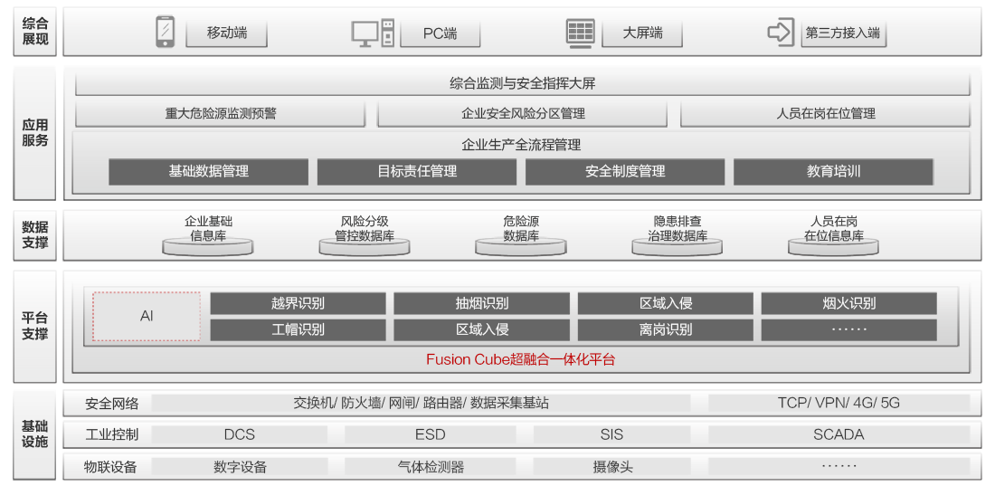 围绕“化工本质安全”的核心命题,高效构建“可防可控”的闭环安全管理体系,以化工生产安全防控管理为核心目标,应用工业互联网网络、安全及平台技术,打造以“安全生产全流程管理”为中心,融合重大危险源监测预警、企业安全风险分区管理、人员在岗在位管理和企业生产全流程管理于一体的安全生产信息化系统,助力企业按需、按步构建化工生产全链条、全过程、全方位的安全防控体系,持续提升化工本质安全能力。